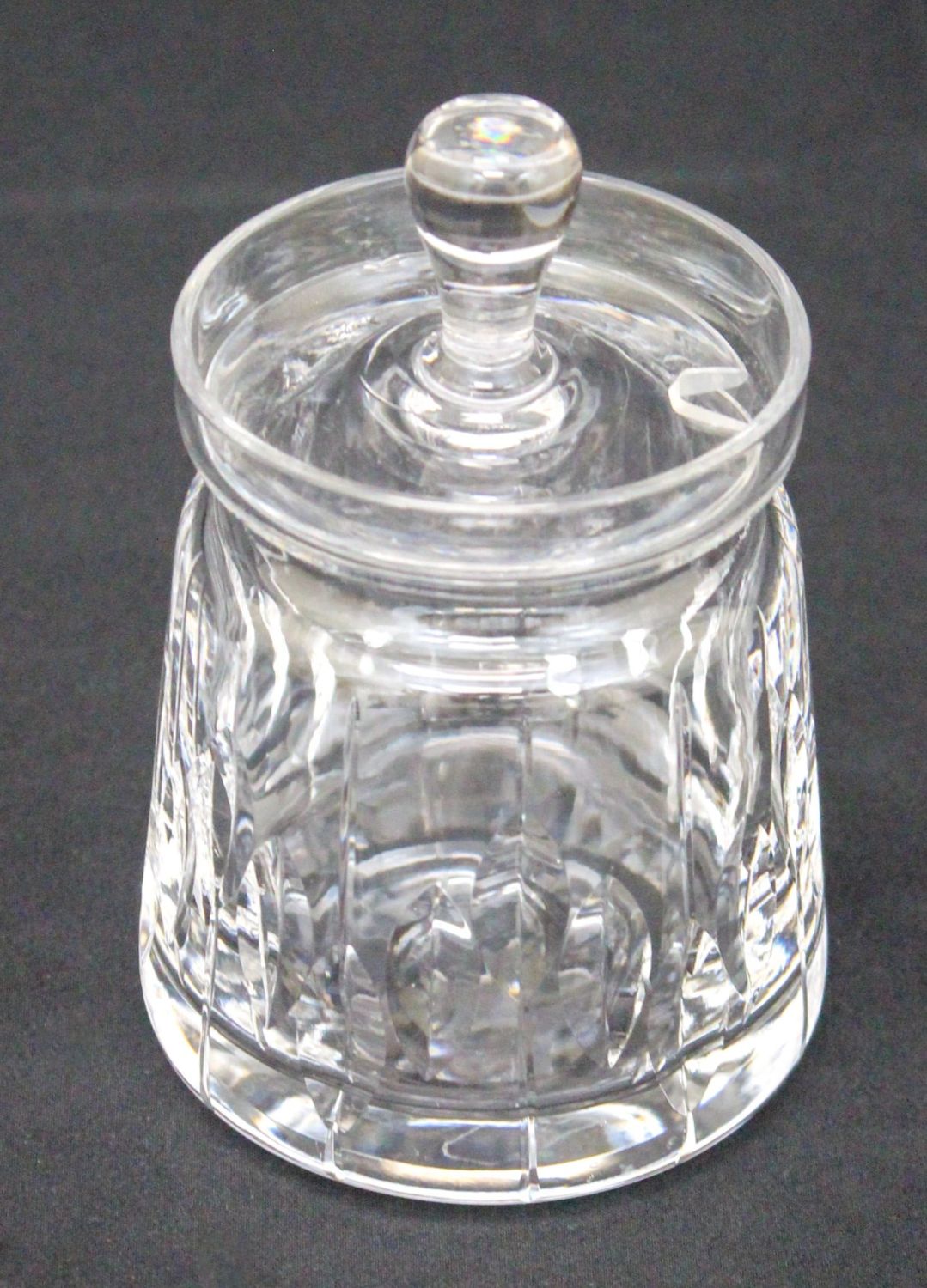 Thomas Webb cut crystal jam/marmalade Jar with stoper, "Thos Webb England" acid etched mark to the base, 5"h x 3"d Condition: Fair, small chip on the edge of the lid
