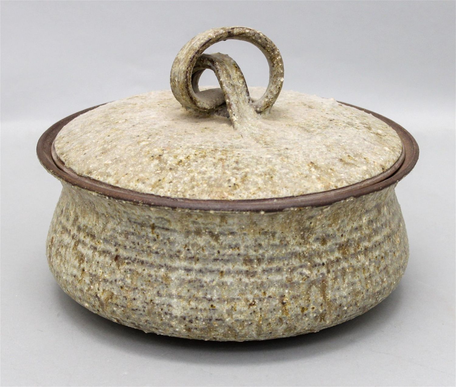 Salt glazed stoneware pot with lid , cobalt blue interior, possibly signed Lindgren on the bottom, 8"h x 9.5"d Condition: Good