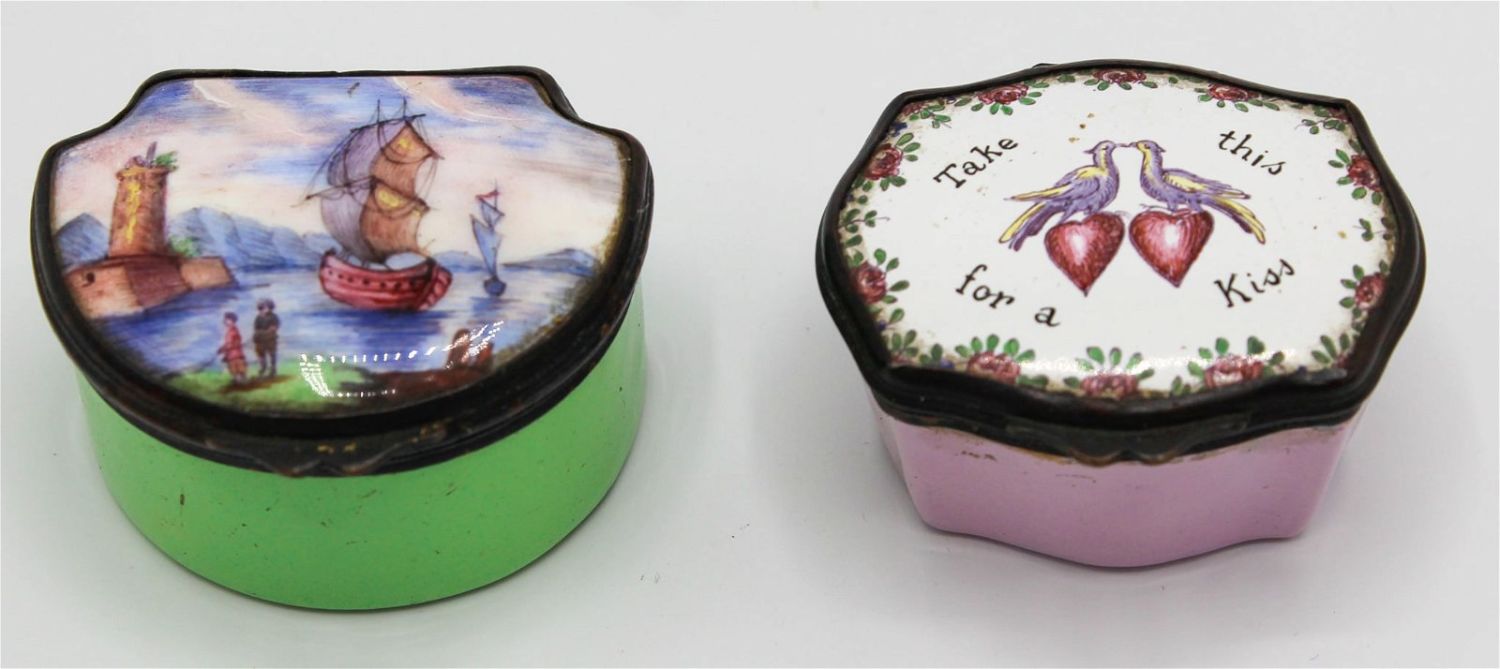 A group of (2) possibly antique, enamel trinket boxes, harbor scene, and "Take this for a Kiss", 1"h x 2"w x 2"d, 1"h x 2"w x 1.5"d
