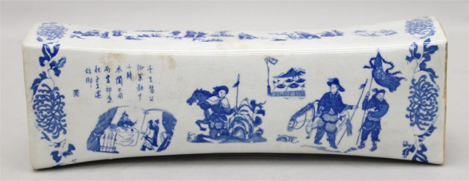 Chinese white and blue ceramic pillow/hat stand with chinese characters depecting daily life, 13.5"h x 4.5"w x 3"d