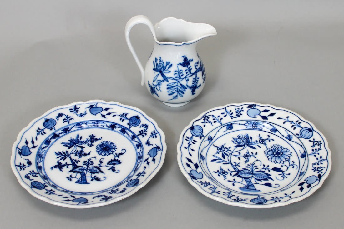 Meissen near pair porcelain salad plates in the Blue Onion pattern, and a cream pitcher, plates 8"d, Pitcher 5.5"h x 3"d, marked on bottom Meissen