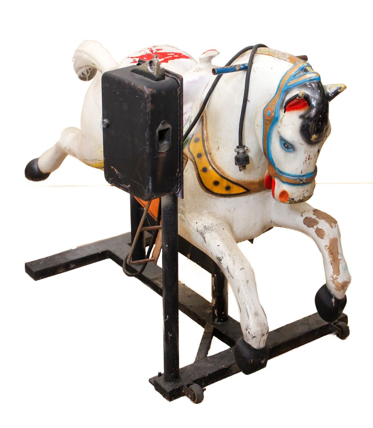 Vintage coin operated children ride white horse with white saddle, 39"h x 25"w x 55"d