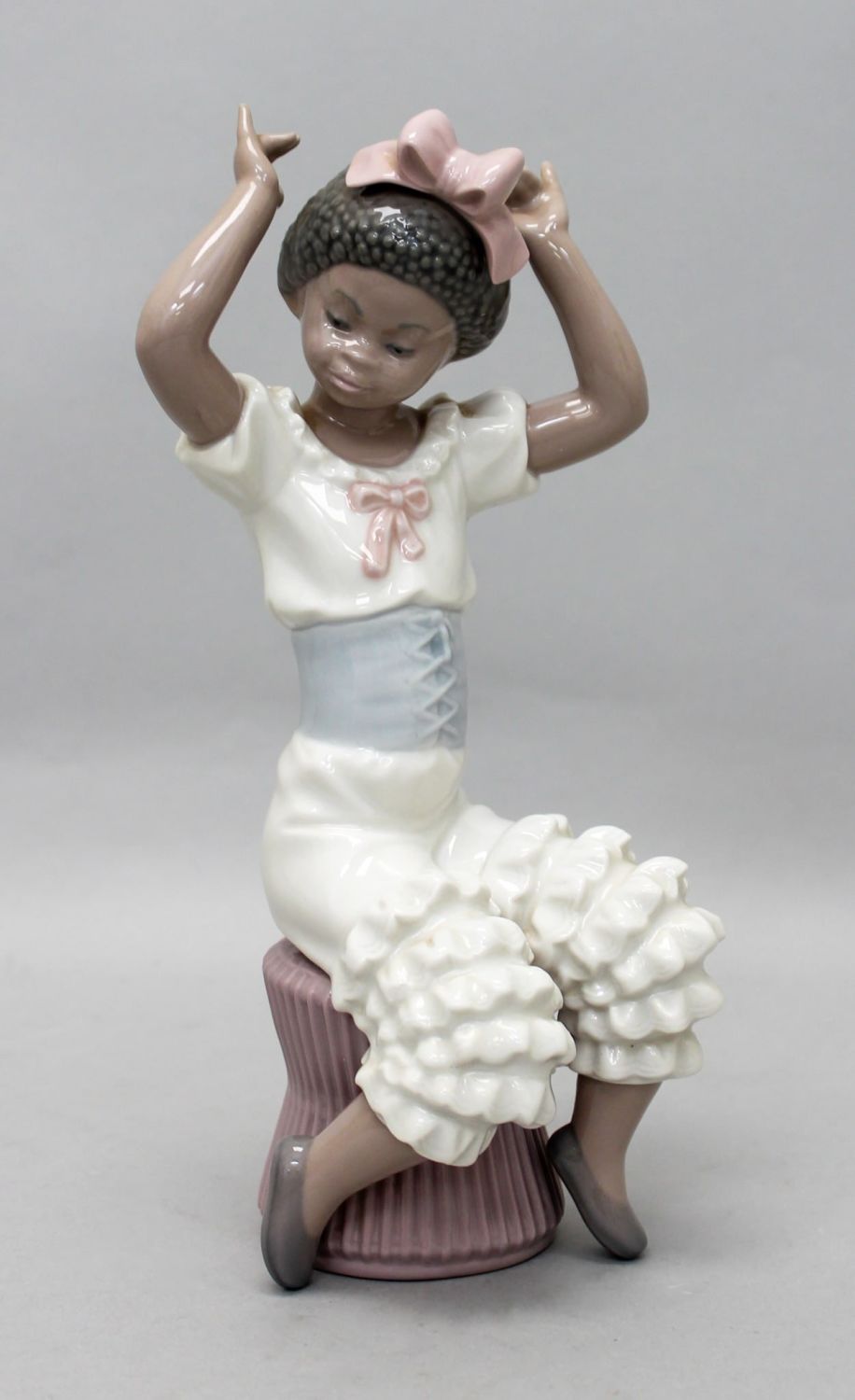 Lladro figurine "Rhumba" 5160, seated girl in white outfit with pink bow on her head, mark on bottom Lladro Hand Made in Spain DAISA, retaired, 9"h x 3"w x 3"d