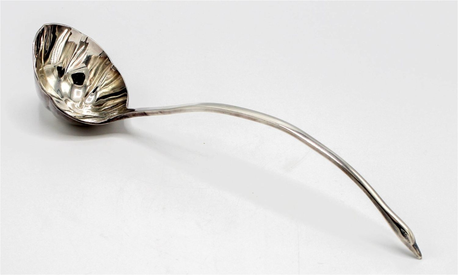MMA reproduction of Chinese Tang Dynasty silver plated swan neck handle ladle, marked on handle back MMA 1987 Korea, 14"l x 3"d