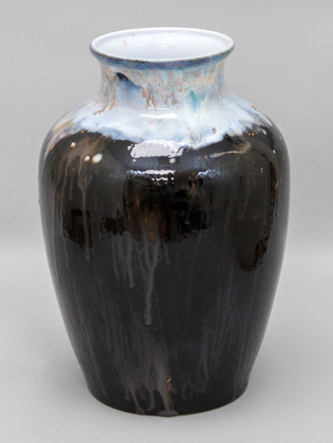 Chinese drip glaze wide neck ceramic vase, predominantely black, Chinese stamp on bottom, 14"h x 9"d