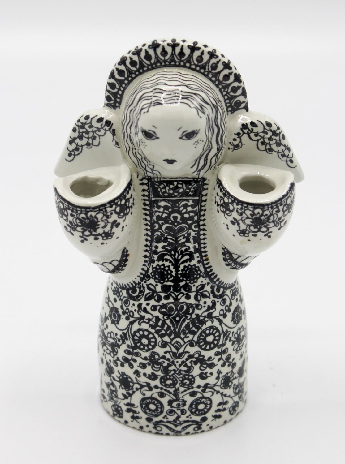 Vintage Danish Nymolle black and white porcelain angel candle holder figurine, marked on bottom Decor: 3315. 474 EB, 5.5"h x 3.25"w Condition: Good