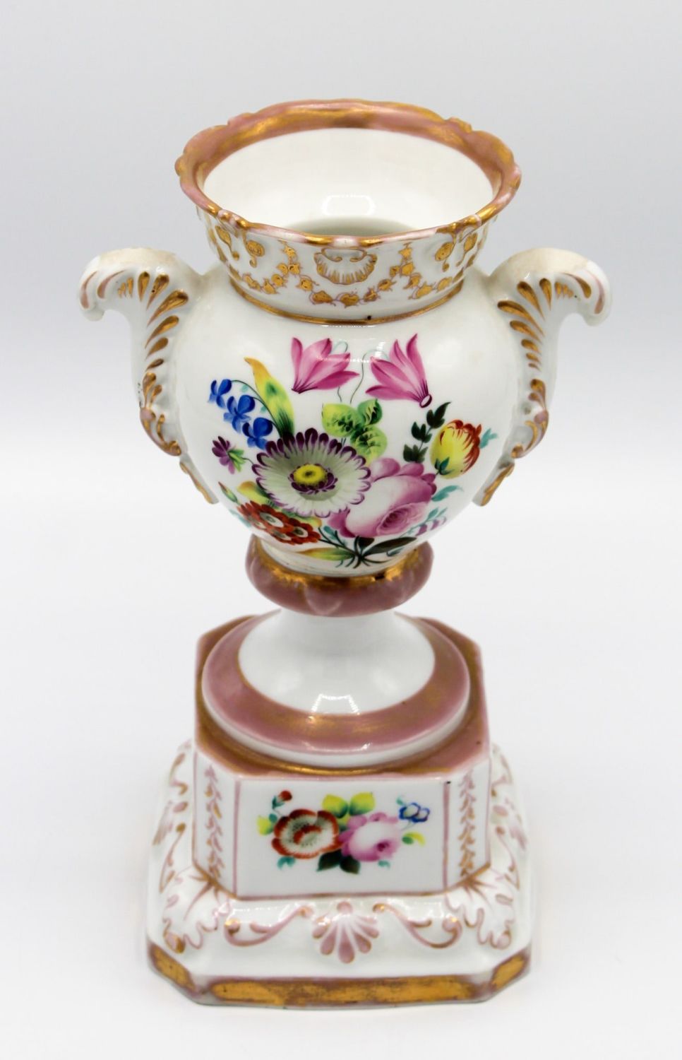 Vintage handpainted porcelain urn on pedestal with floral design, unmarked, 9"h x 5.5"w x 4"d