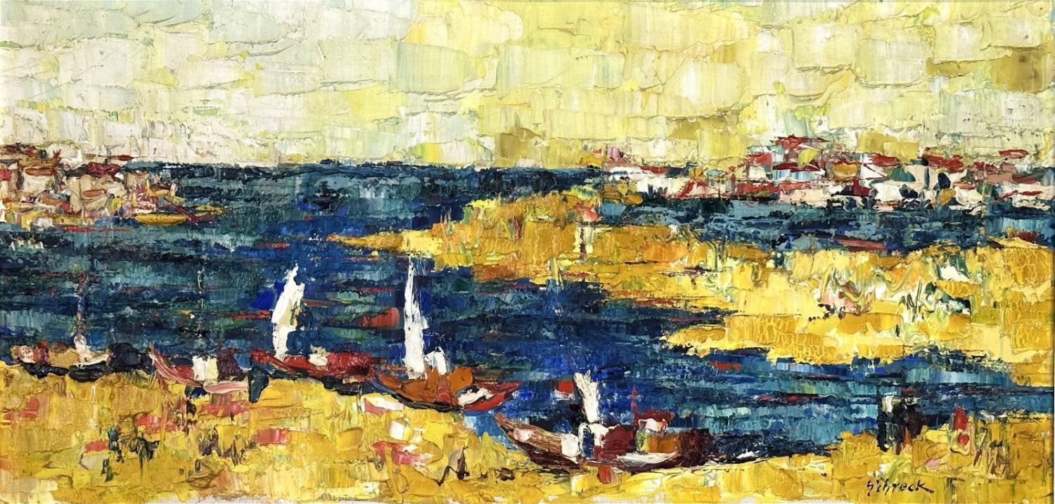 Title: "Antibes Coastline". Signed. Lovely heavy impasto impressionistic paint application oil on canvas. Sight: 15" x 30" Frame: 21" x 36" Condition: Good. Dirty matte. Tight paint.