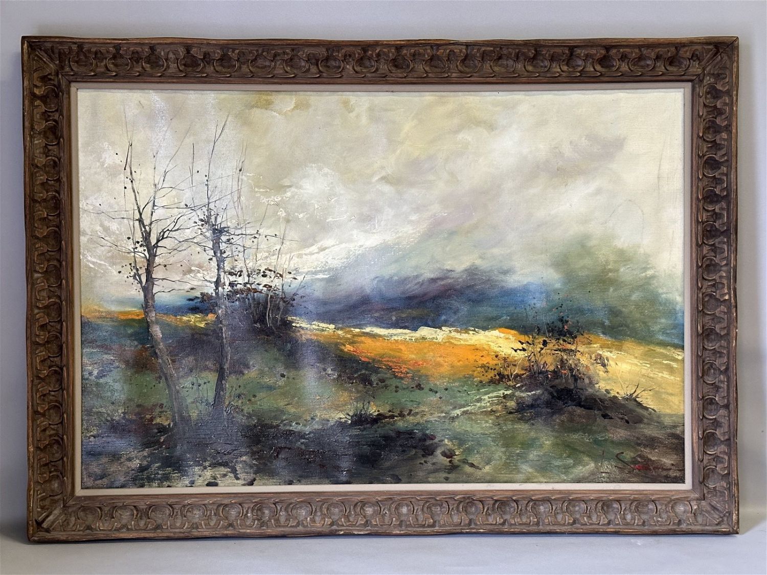 Oil on canvas. Signed illegibly. Thick expressionist style paint application with wonderful colors. Sight: 24" x 35" Frame: 28.5" x 41" Condition: Good