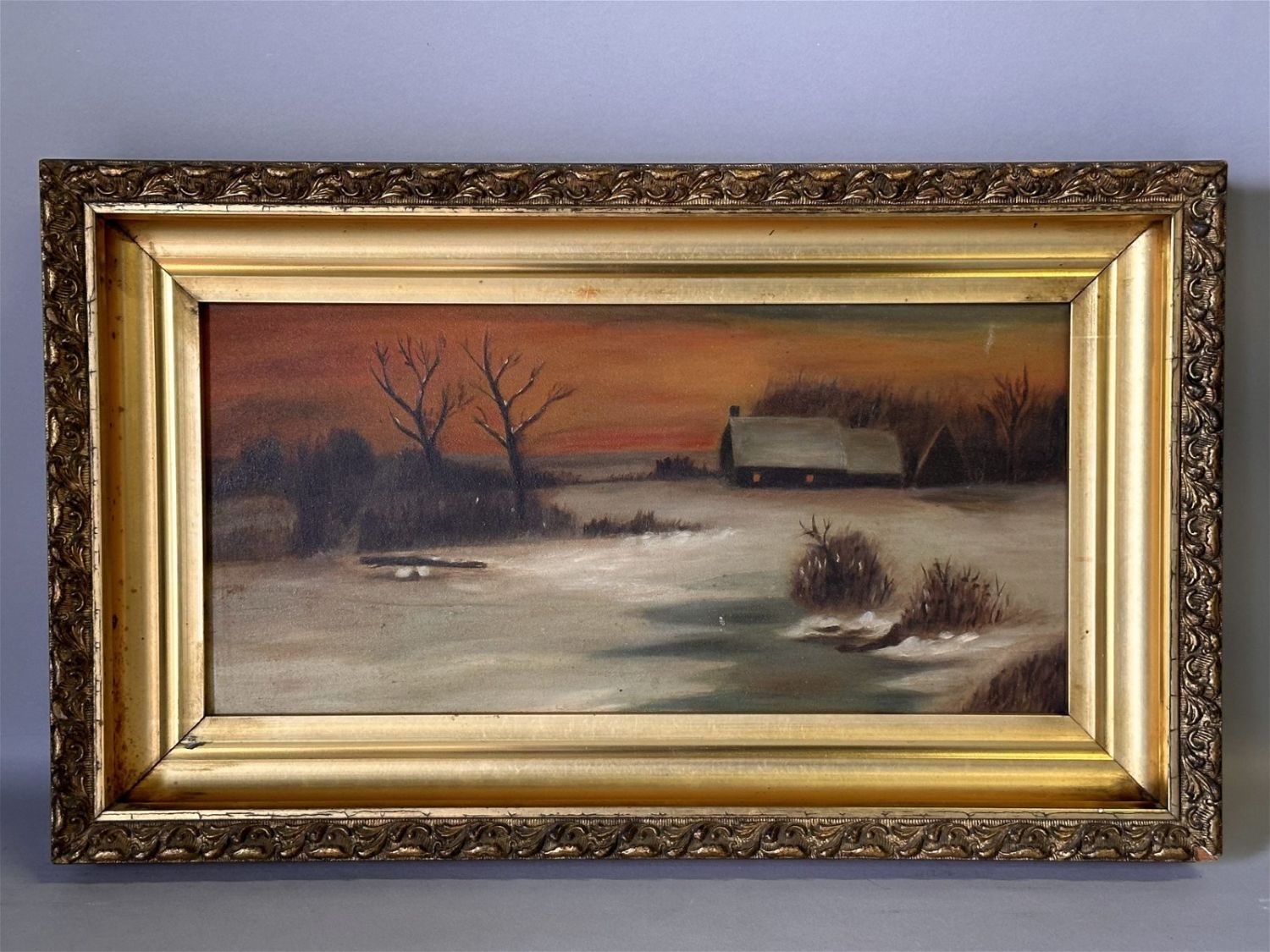 Oil Board (heavy cardboard of the period). Unsigned. Sight: 7" x 14" Frame: 10.5" x 17.5" Condition: Good. One or two surface losses. Frame is dirty in corners as pictured.