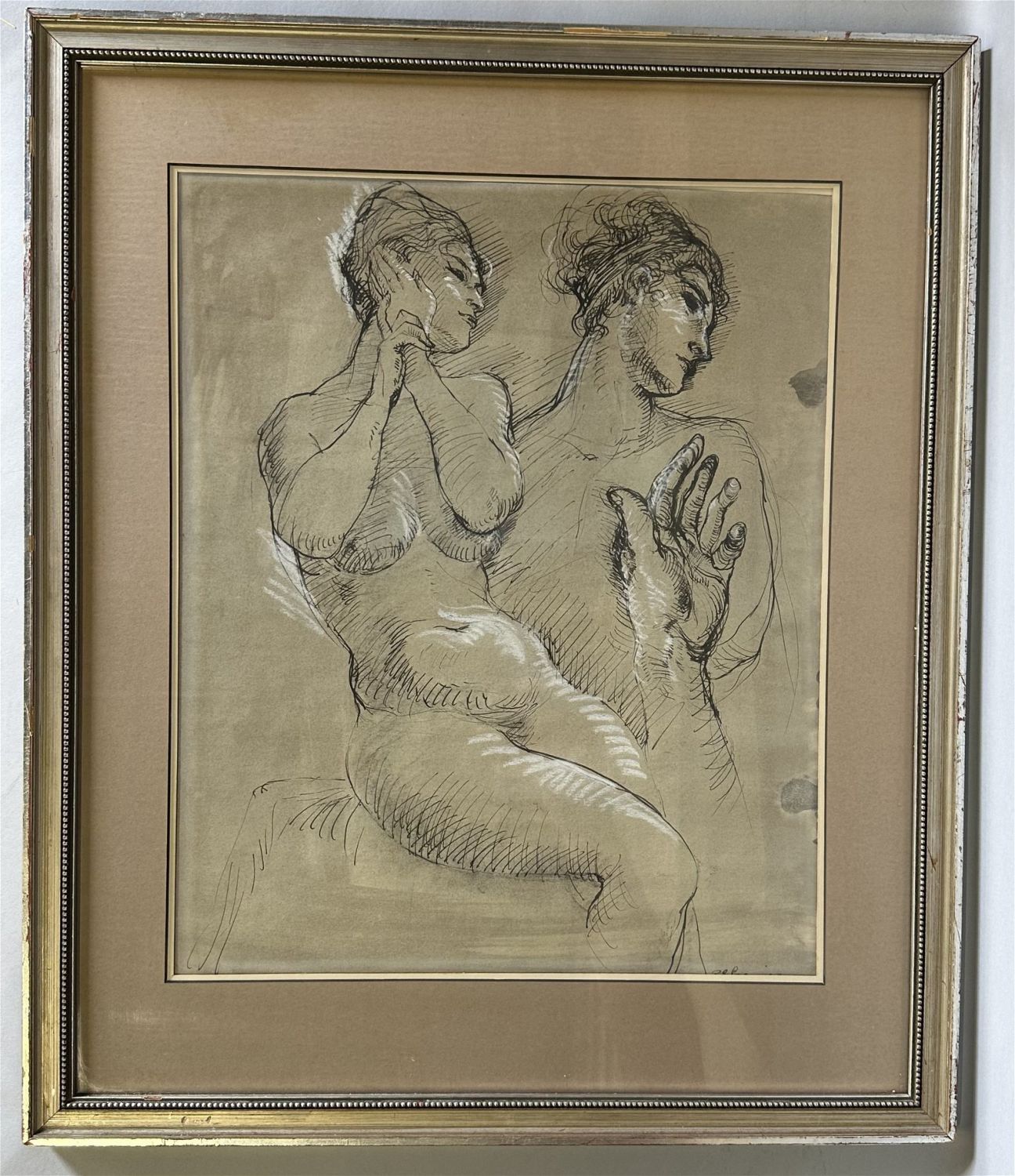 Illegibly Signed. Ink and White Chalk on Paper. Sight: 16 x 13" Frame: 22" x 19" Condition: Good. Frame shows light shelf wear.