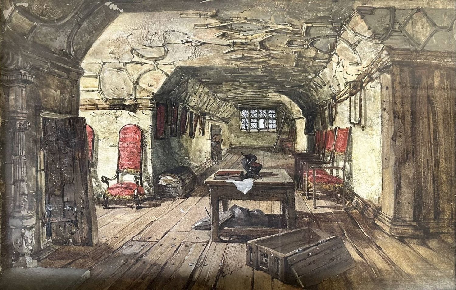 Very rare and superb Samuel A. Rayner (British 1806-1879) watercolor painting on paper done in 1847 titled "Retainer’s Gallery" of an interior room at the Knole House Estate, Kent, England; depicting a medieval knight’s helmet on a table and his armor (armour) shield etc under the table and a wooden chest flung open on the floor. Several high backed red velvet chairs line the walls of the room as do many paintings and empty frames hang askew along the walls. Painted in 1847 at Knole House at Seven oaks, Kent, England which had as does a calendar; 365 rooms, 52 staircases, 7 courts, and is now a museum. Henry VIII was quoted as saying that the Knole estate was on "sounde, parfait, holesome grounde". Additionally, Knole Estate was the setting for the filming of the Beatles video releases of "Penny Lane" and "Strawberry Fields Forever" in 1967. A wonderful painting with so much history that perhaps it should be in a museum itself. Sight: 23.5" x 15" Frame: 30" x 22"