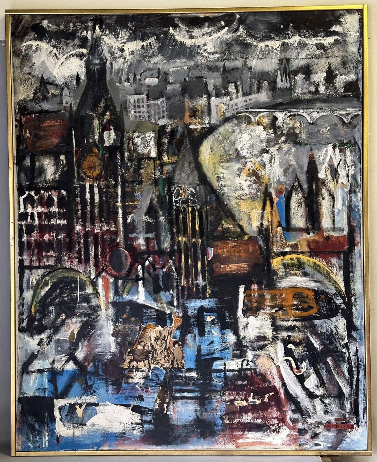 Title: "Two Shillings". Mixed media oil, collage, paint, paper clippings on canvas. Sight: 60" x 48" Frame: 61.5" x 49.5"