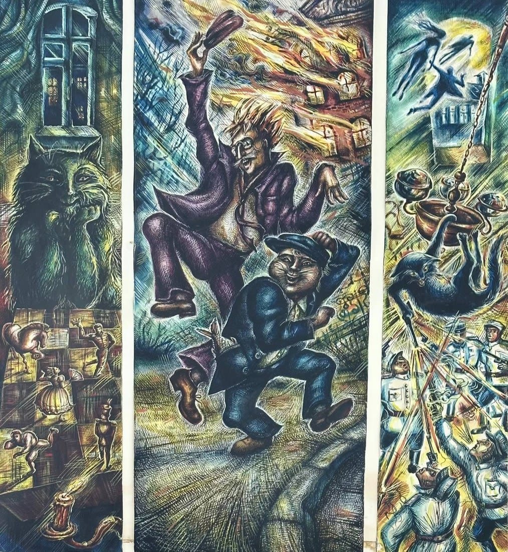 Mixed pen ink watercolors on paper. Illegibly signed in Russian; Dated 1990. Sight: 25" x 29" Frame: 28" x 40"