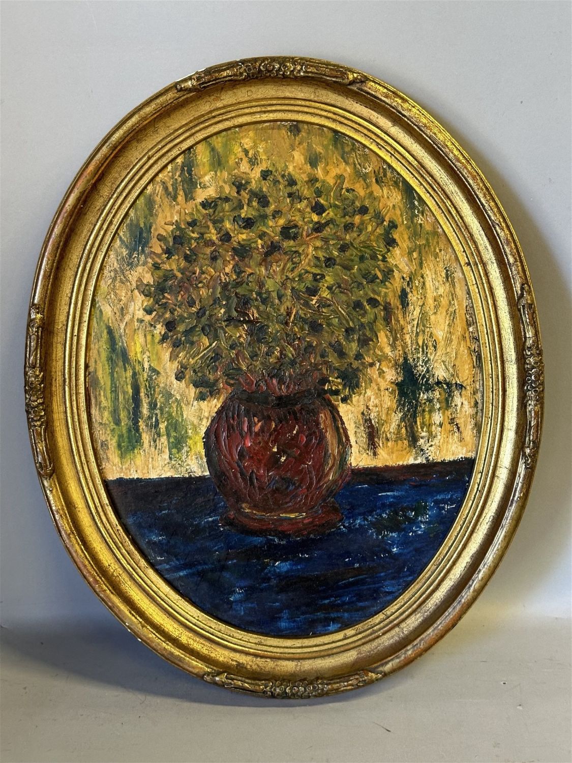 Heavy impasto oil paint on board. Unsigned. Oval Frame. Frame : 16.5" x13.25". Sight : 13.25" x 10.25"