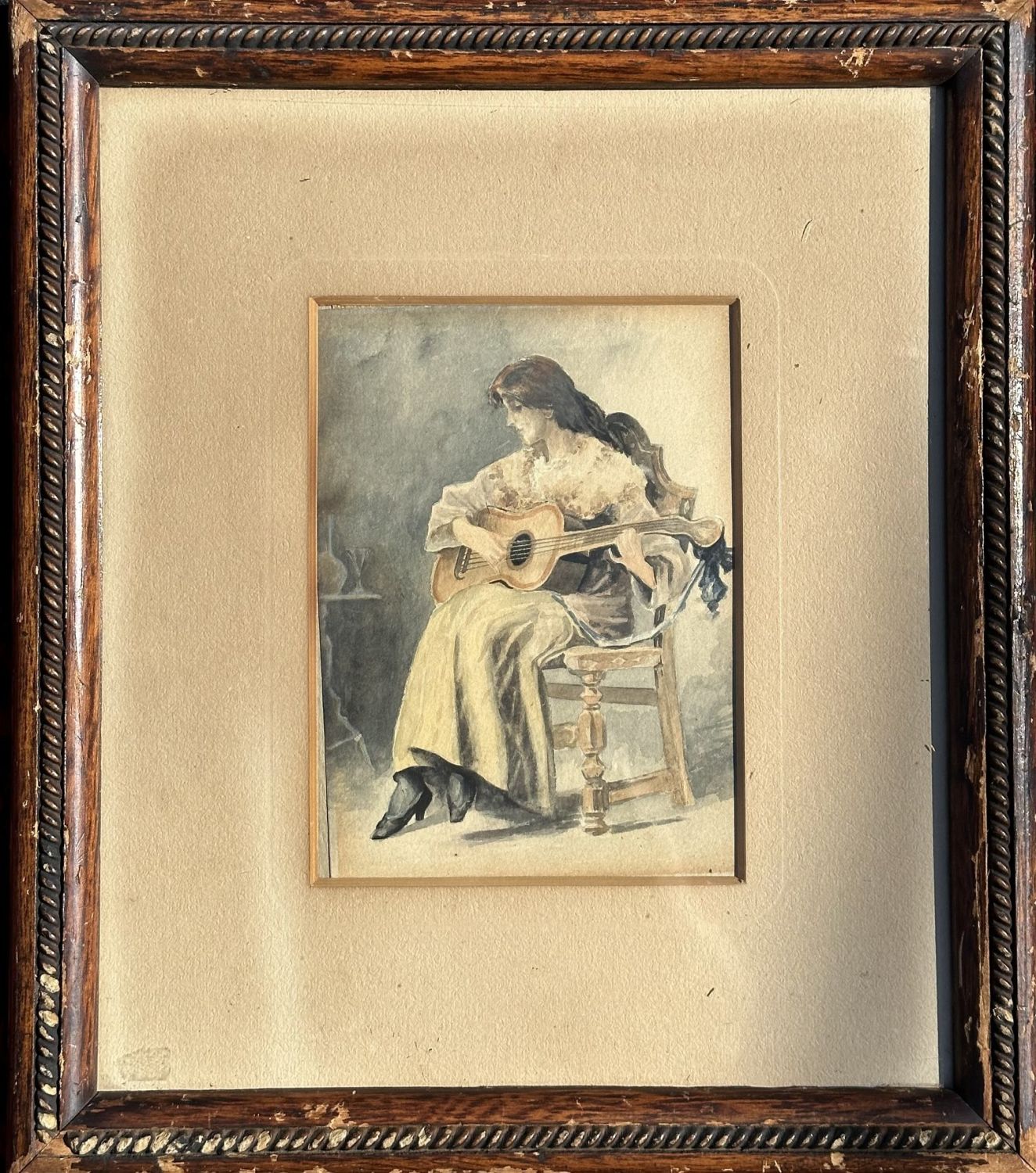 Antique Early 20th Century Watercolor Portrait of a Woman Seated playing Guitar