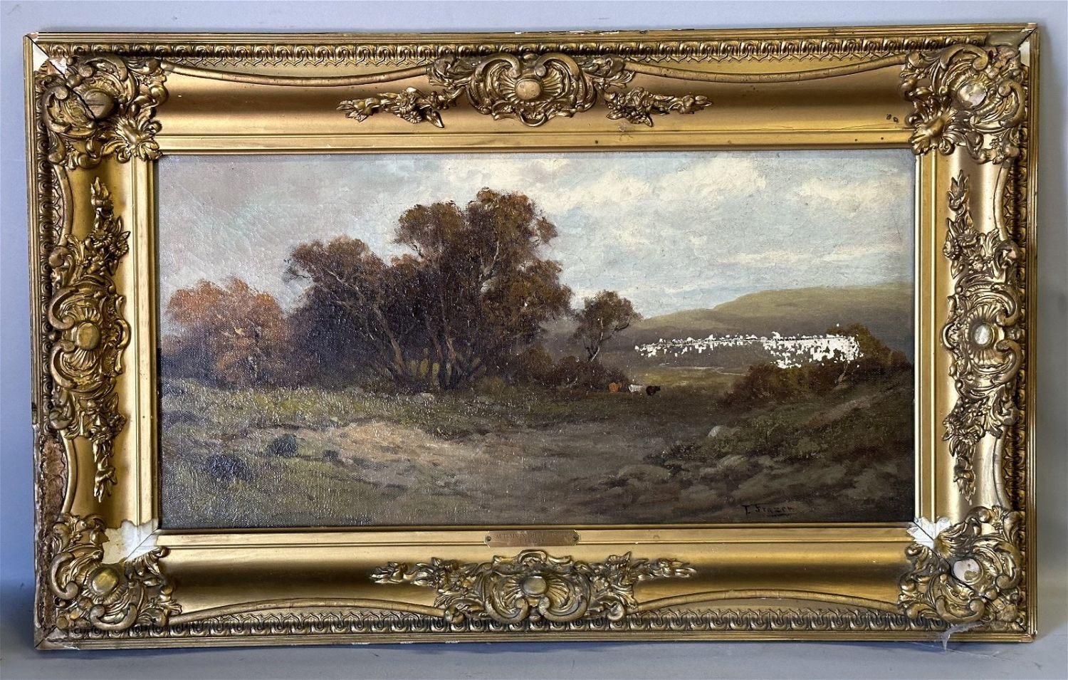 Antique T. FRAZER "Autumn in the Grass Valley" Plein Air Landscape Oil on Canvas with Cows