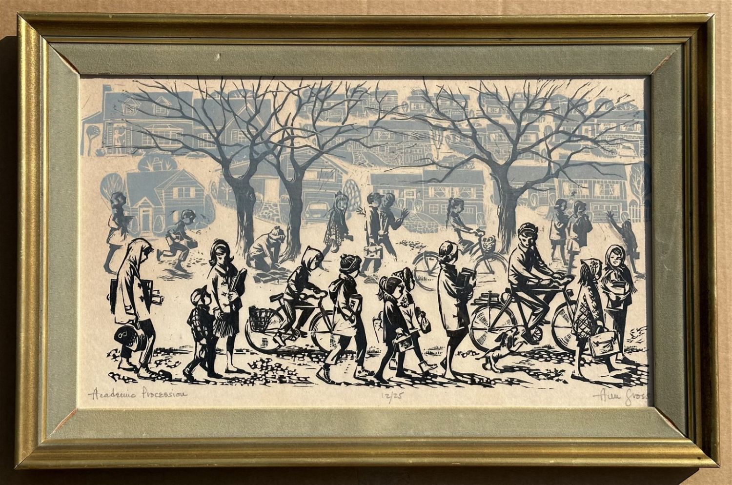 Vintage woodblock print depicting children going to school on a winter day. Signed pencil. Sight:12"x14 Frame:16"x25" Condition: Good