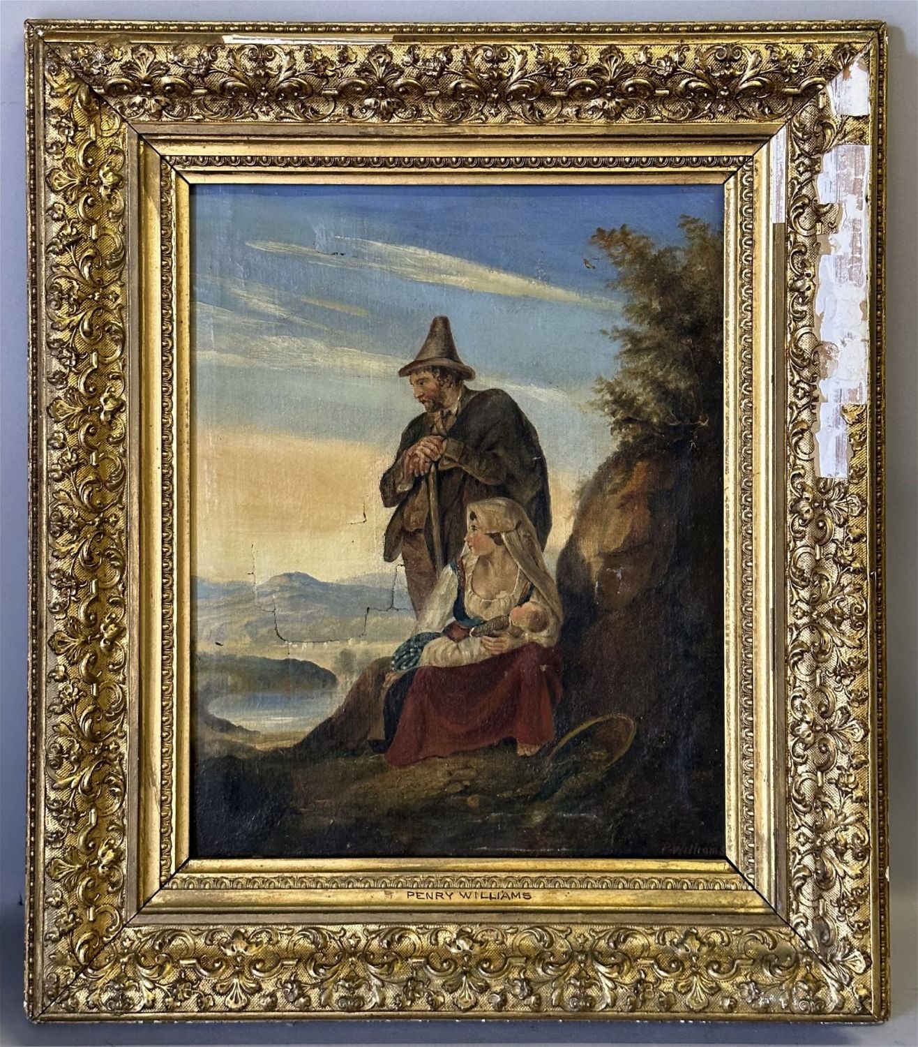 Oil on canvas. Signed lower right. Sight: 15" x 12" Frame: 20.75" x 17.75" Condition: Tears as pictured. Gold gilt gesso frame has losses.