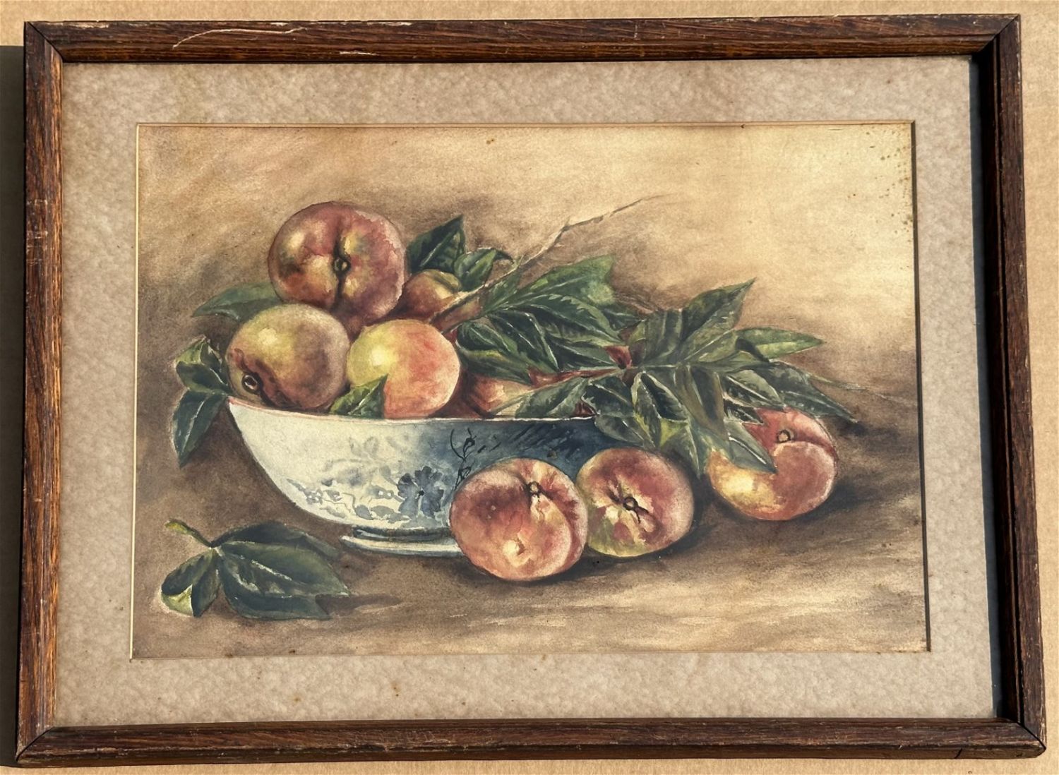 Antique Still Life With Peaches Watercolor In A Chinese Porcelain Blue and White Bowl