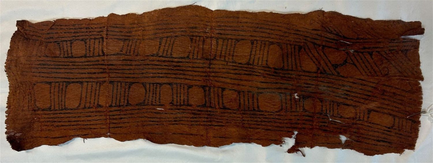 Barkcloth panel from the Mbuti pygmy peoples, Ituri Forest, Democratic Republic of Congo, Central Africa, with traditional fruit juice and charcoal ink decoration, and fruit juice fixative. Likely mid-20th century. Approximate size, 31" x 9"