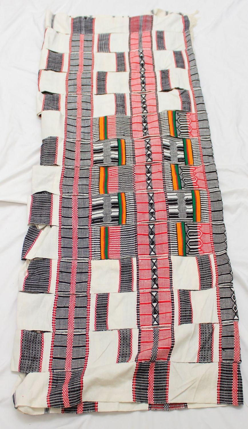 Yoruba peoples, Nigeria, West Africa, strip-woven cotton wrap, strips joined together at 8" intervals, forming an "open" style wrap, mid-20th century. Approximate size, 93" x 58".