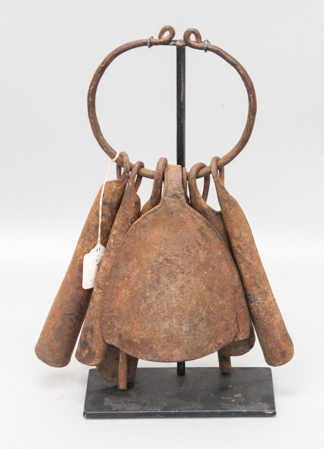 19th Century or early 20th century iron currency, Chamba peoples, East Nigeria, West Africa, good aged patina, with stand. Approximate size, 13.75"H (14"H on stand)