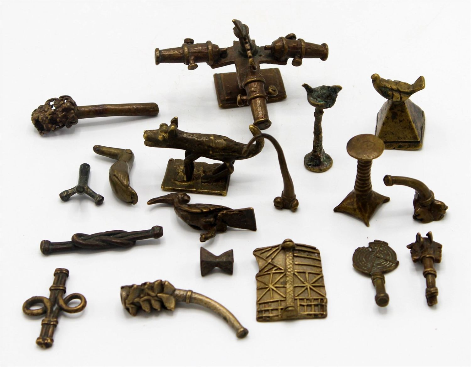 Group of (18) cast bronze/brass goldweights, cast using the lost wax method, including five horns, a shield, a fan, various animals and other forms, Ashanti peoples, Ghana, likely 18th-20th century, West Africa. Approximate size, 2.25"H x 3"W x 2"D