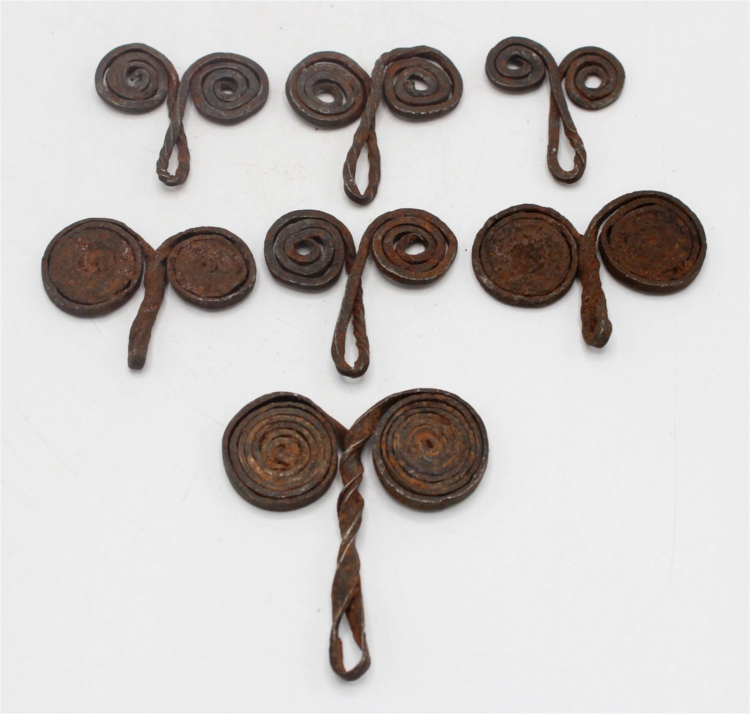 Group of (7) forged iron double-scroll form currency, Mafa, Matakam, Kirdi peoples, Northern Cameroon, Central Africa, likely 19th century or early 20th century Approximate size, 2.25" x 2" (largest).
