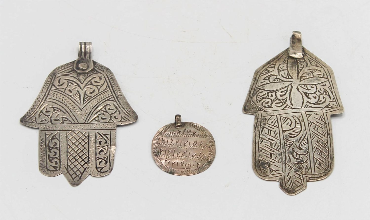 Group of (3) A silver (spirit possession) cult amulet, North African, likely Nubia or Ethiopia, with inscription, likely early 20th century; and silver North African protective amulets, in hamsa form, likely Berber, Morocco, and likely early 20th century.