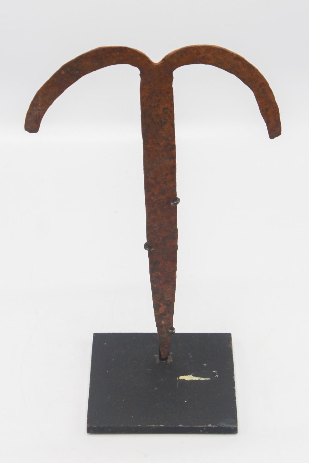 Wrought iron currency, likely 19th century or early 20th century, possibly Bembe/Teke, Democratic Republic of the Congo, or Fang, Gabonese Republic, Central Africa. Approximate size, 9.25”H (10.25”H on custom stand).