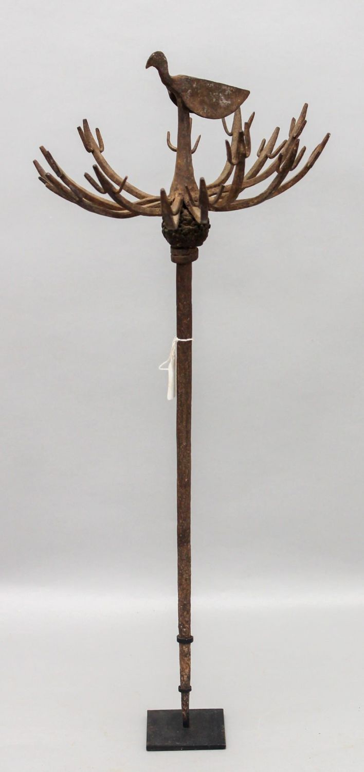 Herbalists staff, wrought iron, Yoruba peoples, Nigeria, West Africa, likely 19th century or early 20th century.Approximate size, 26"H x 12"W, Exhibited, "Iron Clad, Fancy Free: Exhibition of African Iron from the Philip Gould Collection", Interchurch Center Gallery