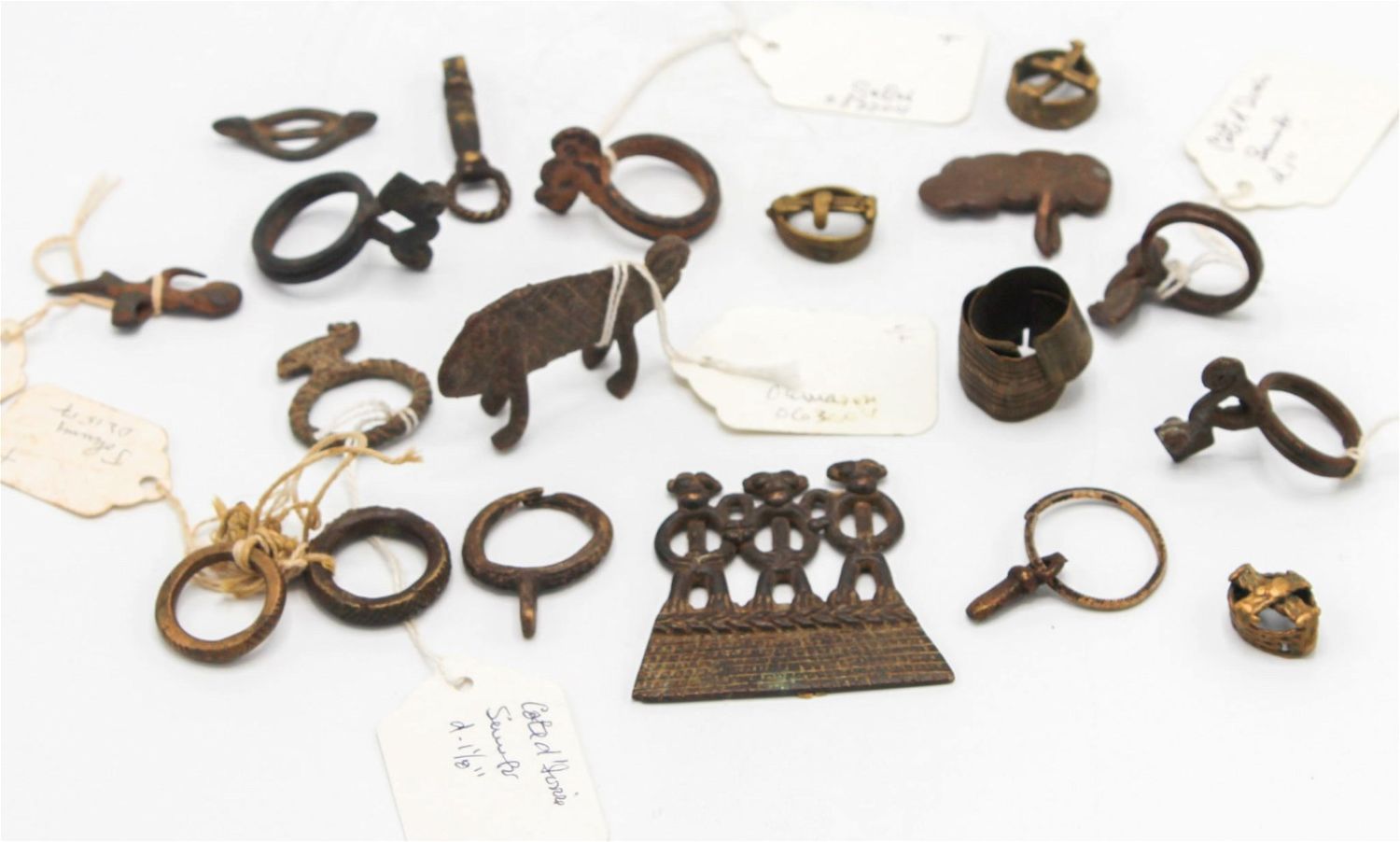 Group of (19) bronze/copper alloy pieces, including rings, amulets, and figures, from a variety of cultures including the Senufo, Baule, Kuba from West and Central Africa, likely 19th or first half of the 20th century. Approximate size, 2.25H x 2.5W.