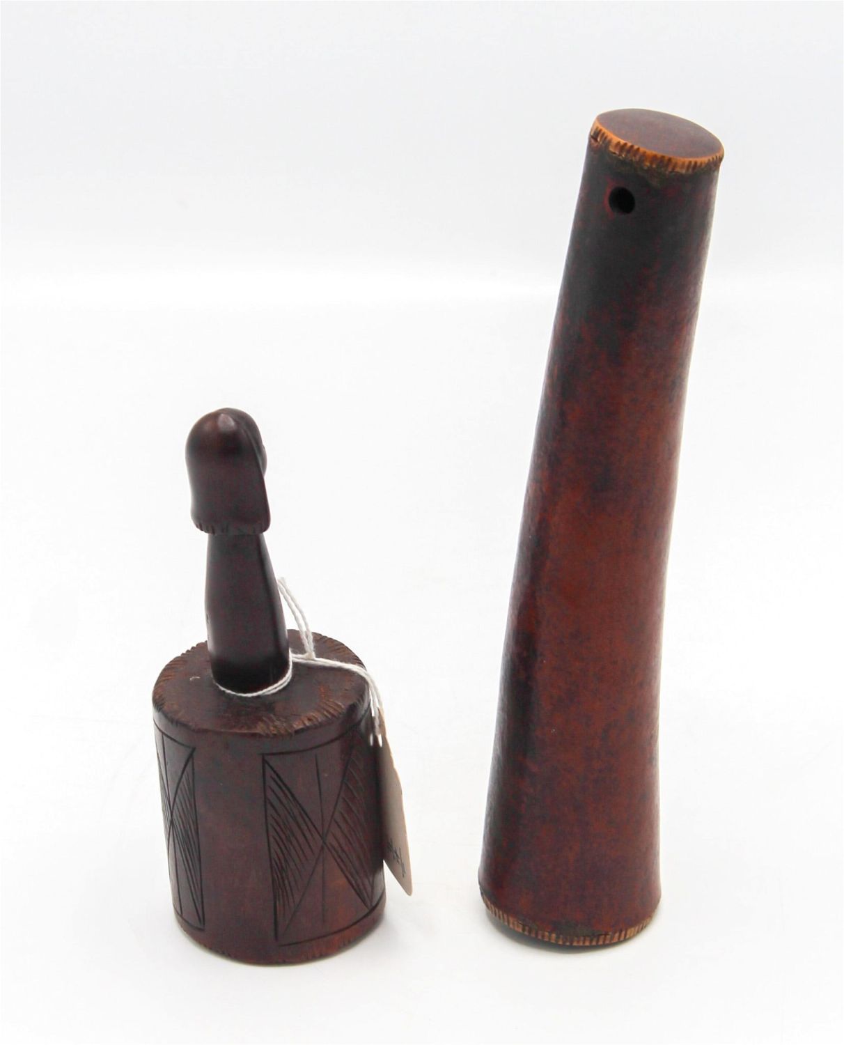 Group of (2) rattles: Fang style, carved wood with ancestor head, Gabonese Republic, Central Africa, and a tubular carved wood rattle, unknown culture, 20th century. Approximate size 8"H (larger) and 5.75"H (smaller).