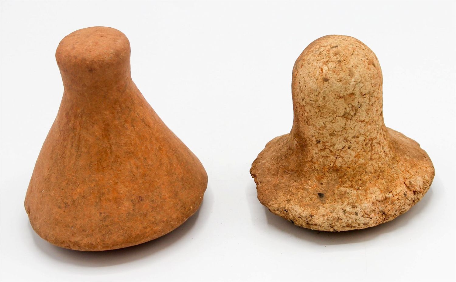 Group of (2) terracotta pestles, likely from the Inland Niger Delta, West Africa, showing significant use, and possibly of considerable age (terracotta pestles have been used in the Sahel area since the Iron Age). Approximate size, 5"H (larger), 4.5"H (smaller).
