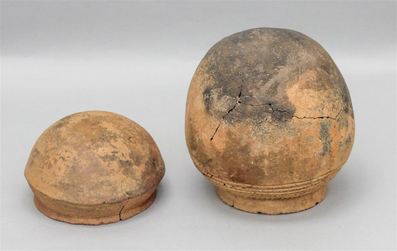 Group of (2) terracotta vessels, possibly Calabar, Cross River, Nigeria, of significant age. Approximare size, 7"H x 6.75" diameter (larger vessel); 3.5"H x 5.25" diameter (smaller vessel).