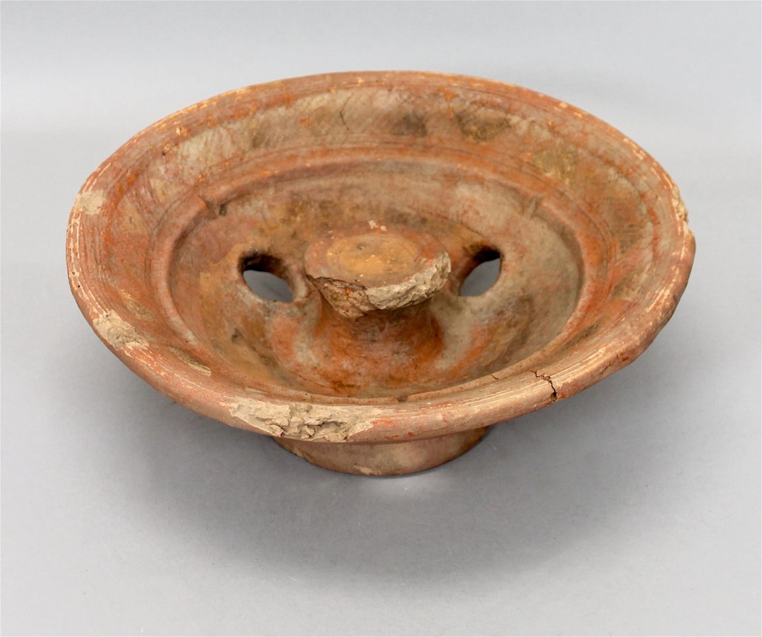 A ritual terracotta vessel, Sahona, Mali, 19th/early 20th century, retains remnants of painted decoration both sides of the vessel. Approximate size, 4.5"H x 12.25"W.