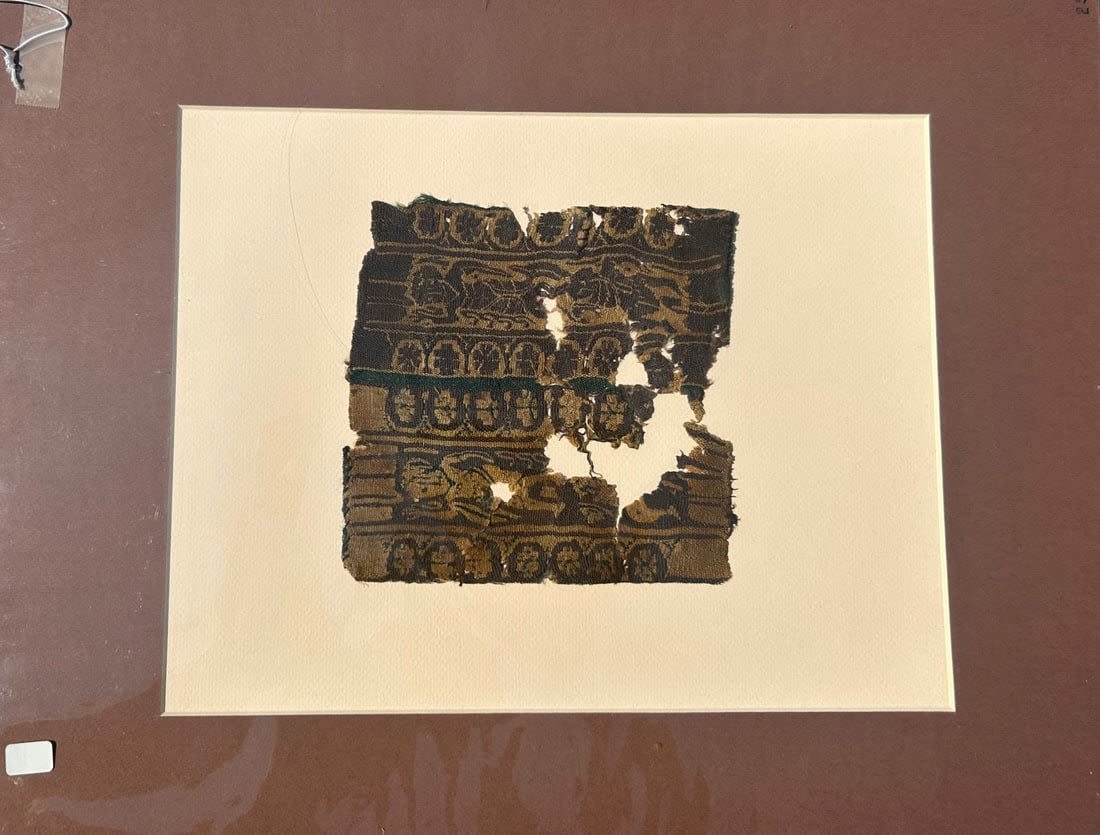 3rd – 10th Century Coptic textile fragment, human figures, decorative motif’s, Egypt, North Africa. Approximate size 7"H x 6.75"W, with a mat with outside dimensions 20"H x 16"W.