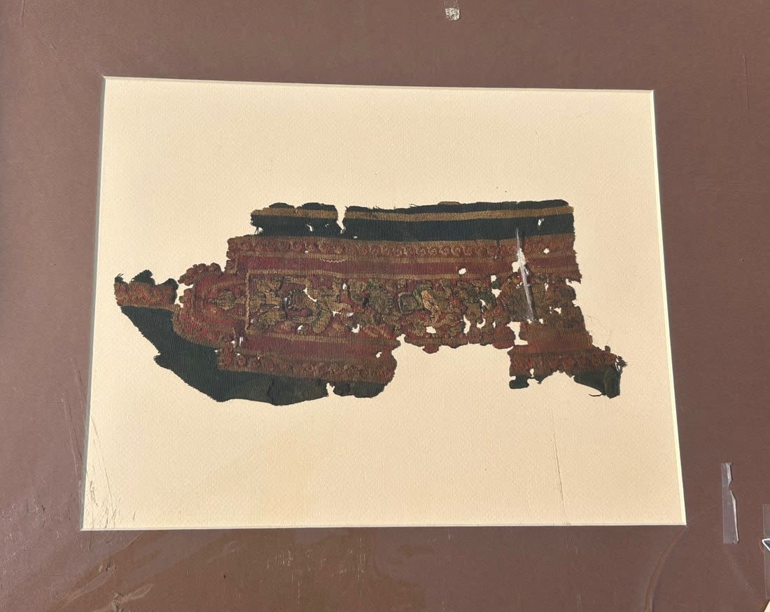 3rd – 10th Century Coptic textile fragment, human figures with decorative border, Egypt, North Africa. Approximate size 12"H x 5"W, with a mat with outside dimensions 20"H x 16"W.