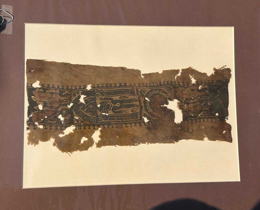 3rd – 10th Century Coptic textile fragment, decorative panel with human figures, Egypt, North Africa. Approximate size 15"H x 6"W, with a mat with outside dimensions 20"H x 16"W.