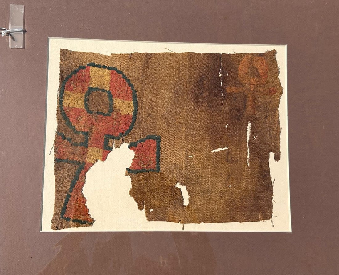 3rd – 10th Century Coptic textile fragment, with ankh forms, Egypt, North Africa. Approximate size 10"H x 12.75"W, with a mat with outside dimensions 20"H x 16"W.