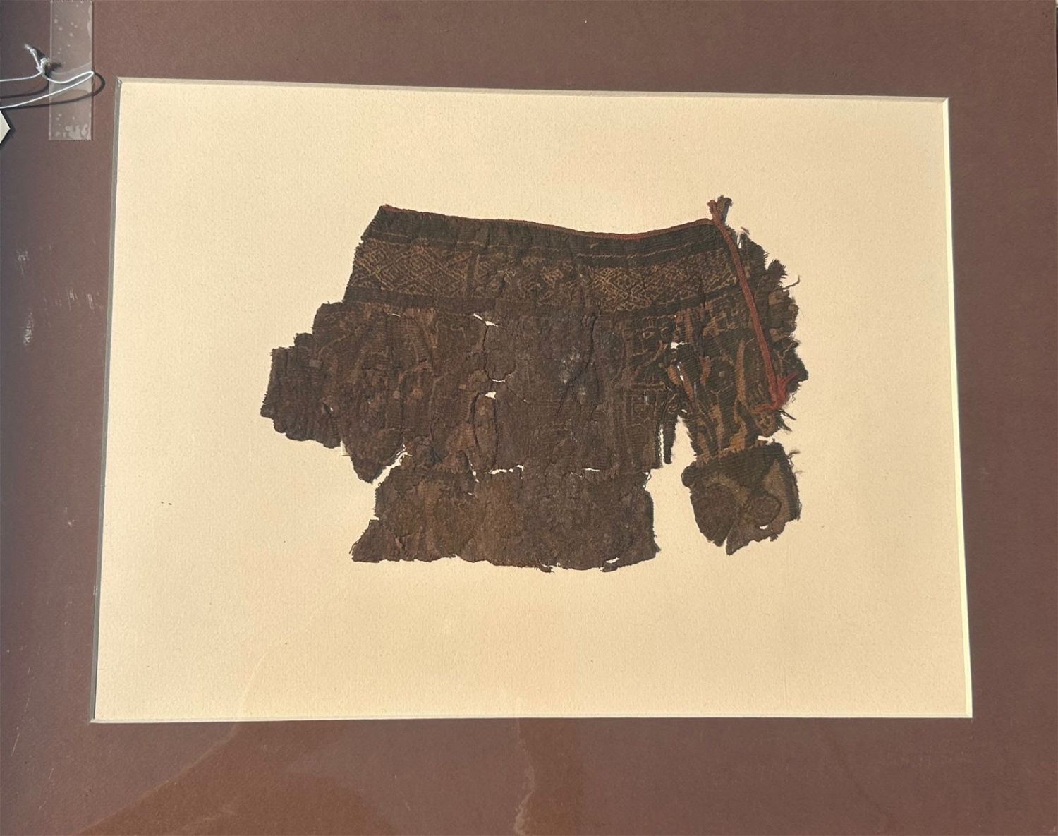 3rd – 10th Century Coptic textile fragment, complex decorative design, Egypt, North Africa. Approximate size 10"H x 6.5"W, with a mat with outside dimensions 20"H x 16"W.