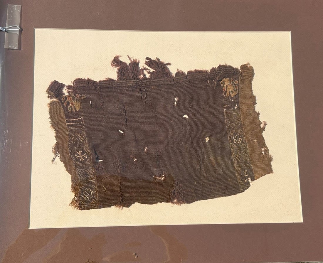 3rd – 10th Century Coptic textile fragment, with elegant border design including cross and polychrome motif, Egypt, North Africa. Approximate size 12"H x 8"W, with a mat with outside dimensions 20"H x 16"W.