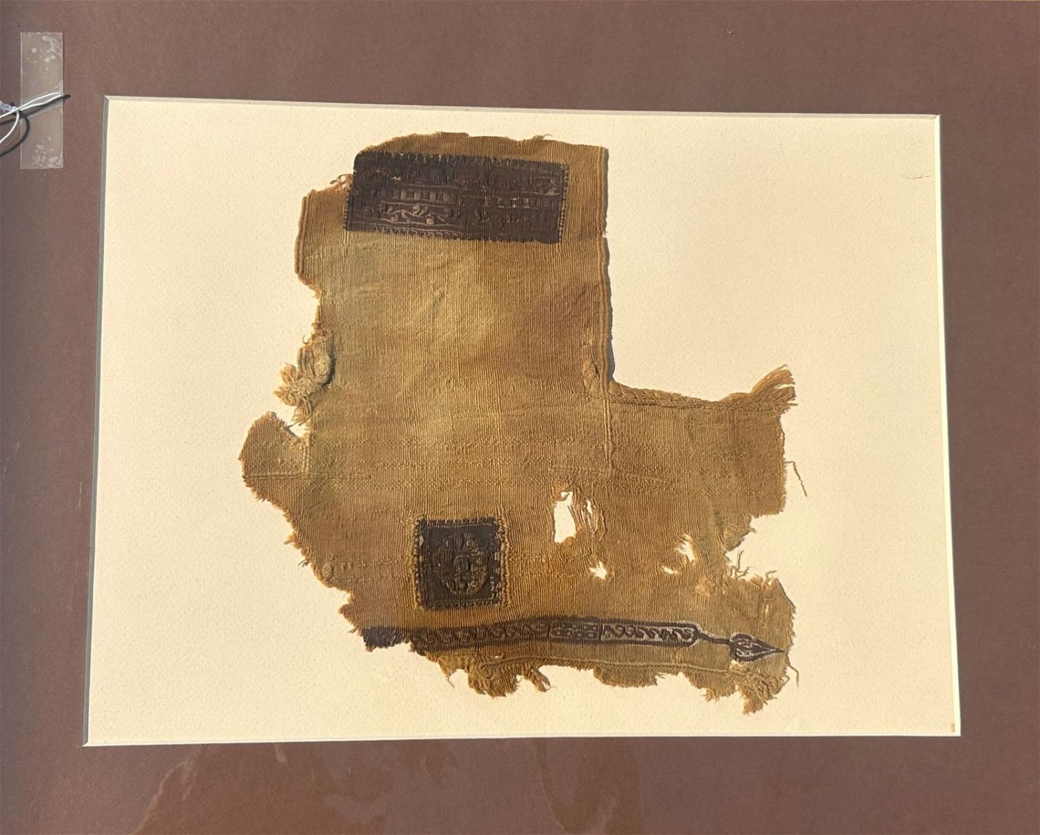 3rd – 10th Century Coptic textile fragment, elegant decorative border, Egypt, North Africa. Approximate size 10"H x 10"W, with a mat with outside dimensions 20"H x 16"W.