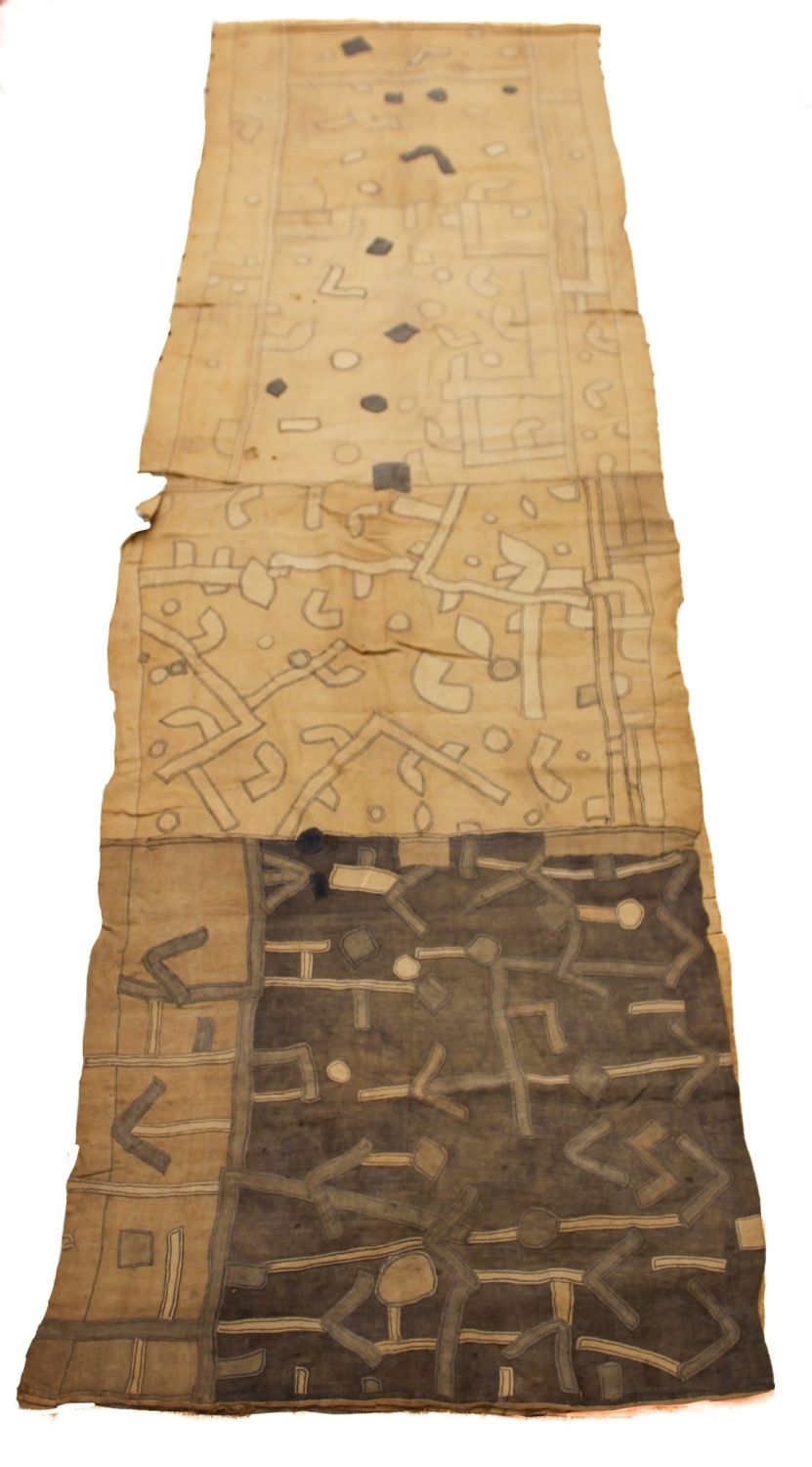 Kuba peoples, Democratic Republic of Congo, Central Africa, an embroidered woven raffia ntshakishwepi, second up in the hierarchy of cloths work by the Bushong. Nice, well-used example, 200" x 32"