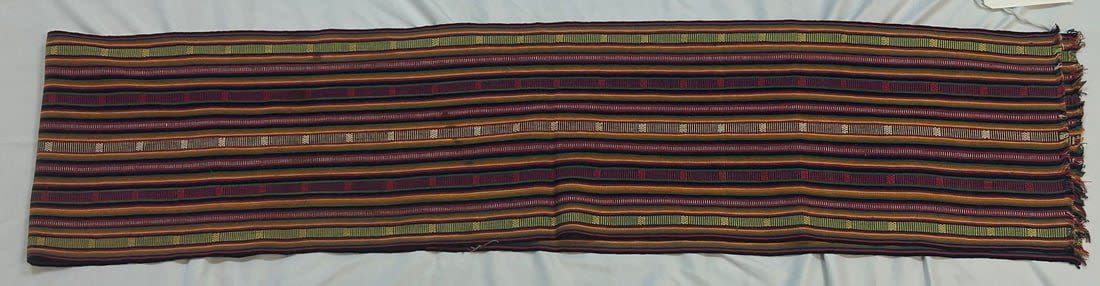 Kente strip woven silk or Rayon textile, Asante or Ewe peoples, Ghana or Togo. Likely mid-20th century, 124" x 14"