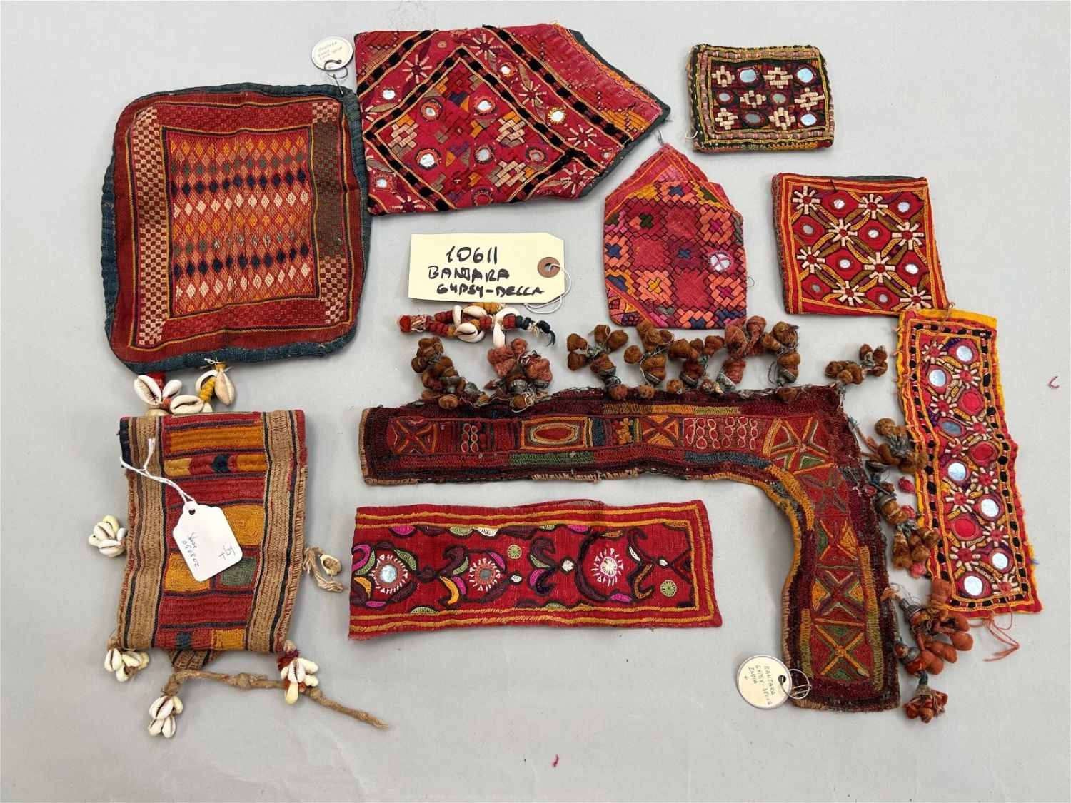 Group of (9) India, Banjara people, embroidered accessories, largest 12"l x 8"w, smallest 4"l x 3.5"w