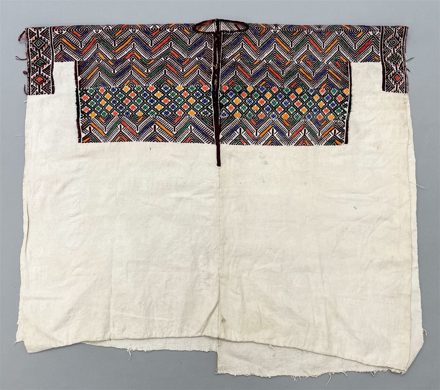 Nahuala, Solola, Guatemala, vintage woven undyed cotton "Huipil" tunic embroidered with multicolor symbolic pattern, 28"l x 31"w