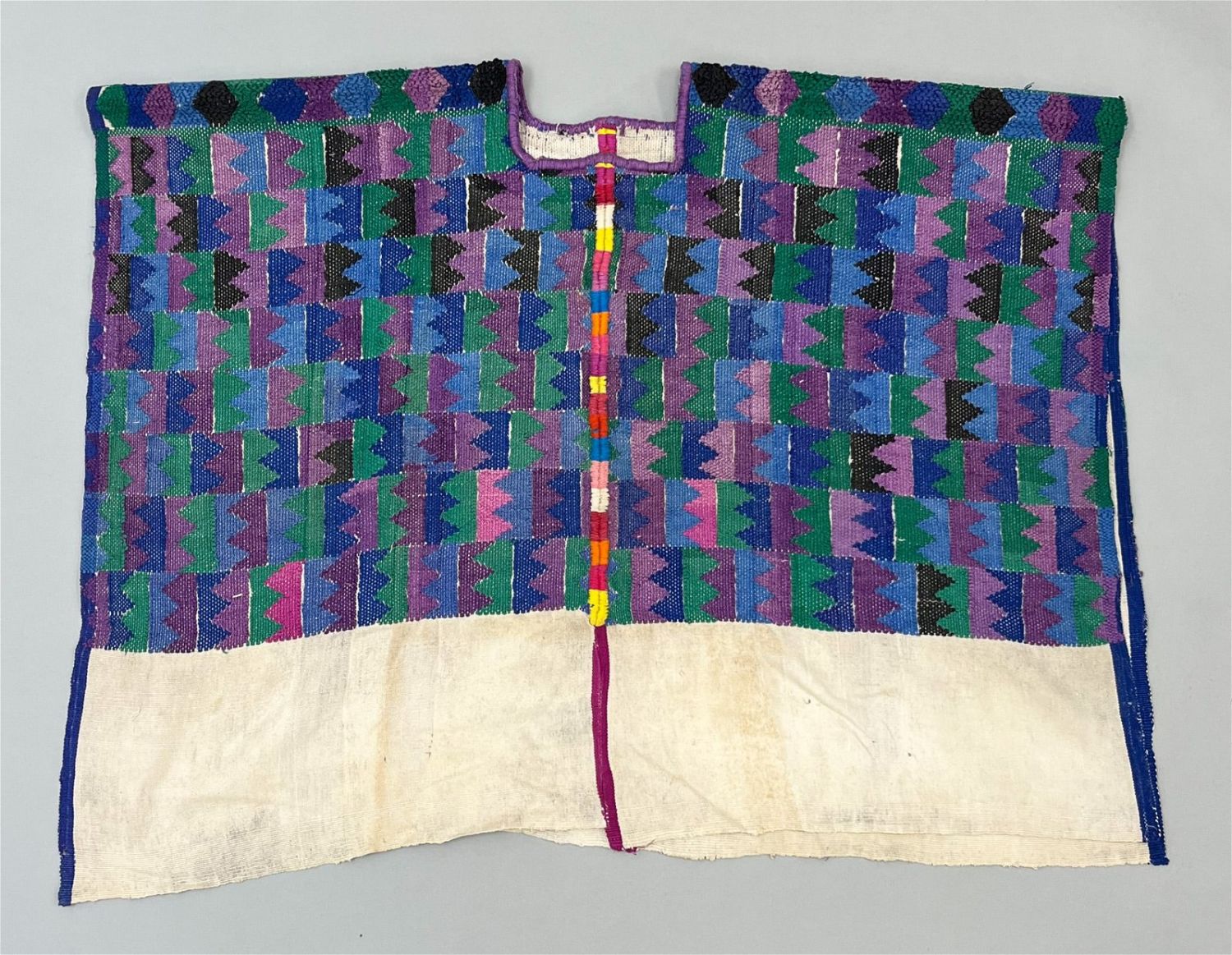 San Pedro Sacatepequez, Guatemala, vintage woven cotton "Huipil" tunic, undyed cotton bottom side, upper with muted color mountain shape pattern, 26"l x 33"w