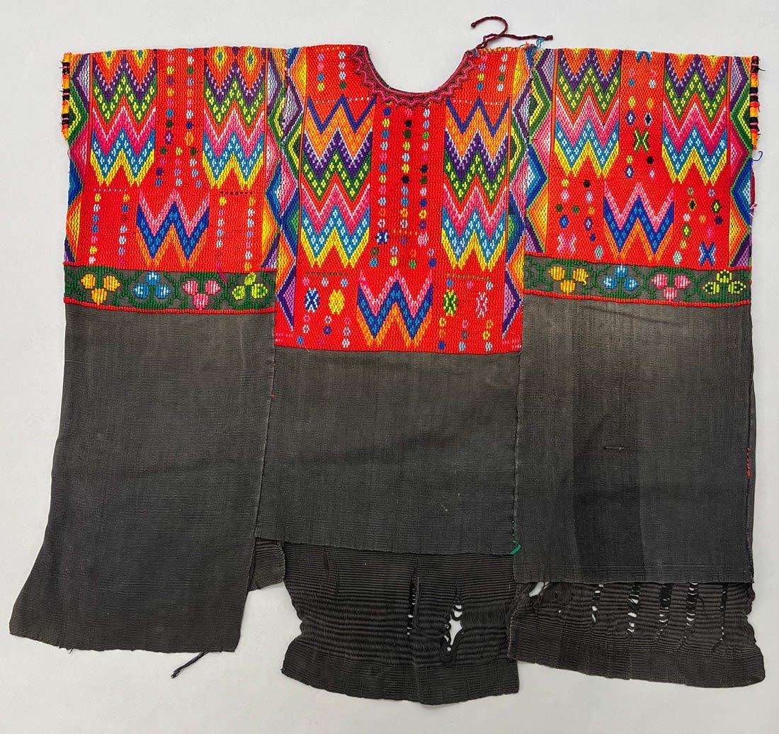 Chichicastenango, El Quiche Department, Guatemala, vintage woven cotton "Huipil" tunic, faded black bottom with geometric vibrant tones, 25"l x 28"w
